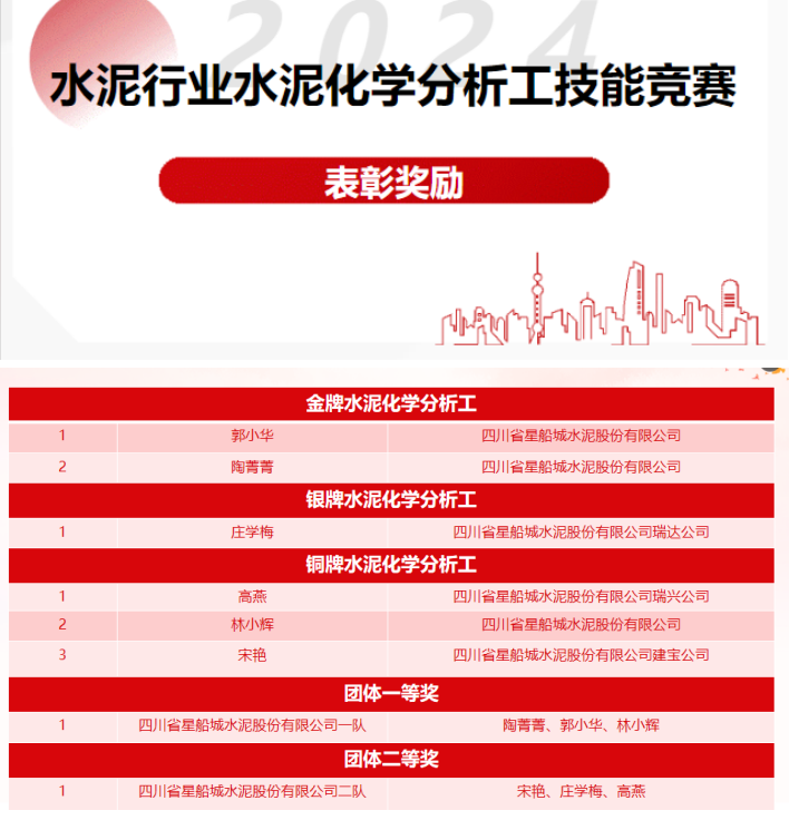 9月24日,由中國水泥協(xié)會發(fā)布關(guān)于《2024年水泥行業(yè)水泥化學(xué)分析工技能競賽》表彰獎勵的決定,對8月22日至26日,在四川綿陽舉行的2024年全國水泥化學(xué)分析工技能競賽中涌現(xiàn)出來的優(yōu)秀選手和單位進(jìn)行表彰。其中,星船城公司共6名參賽選手在總共60名參加決賽的選手中脫穎而出,郭小華以總成績第1名、陶菁菁以第3名的成績,榮獲“金牌水泥化學(xué)分析工”稱號;莊學(xué)梅榮獲“銀牌水泥化學(xué)分析工”稱號;高燕、林小輝、宋艷榮獲“銅牌水泥化學(xué)分析工”稱號。星船城公司一隊(陶菁菁、郭小華、林小輝)以總成績第一名榮獲團(tuán)體一等獎;星船城公司二隊(宋艷、莊學(xué)梅、高燕)以總成績第八名榮獲團(tuán)體二等獎;實現(xiàn)全部參賽選手進(jìn)入決賽、全部獲得個人競賽獎及團(tuán)體一、二等獎的歷史最佳戰(zhàn)績。